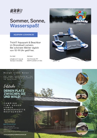 Sommer, Sonne, Wasserspaß! Trick17 Aquapark & Beachbar im Strandbad Losheim. Bei schönem Wetter täglich von 10-19 Uhr geöffnet. Kontakt Adresse info@trick17-trier.de Zum Stausee 201 Tel 0651-17072985 66679 Losheim am See 85